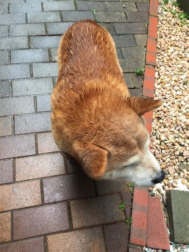 今日も朝から雨 例によって、雨なのに庭に出て、 遊んでいたらしく、 びしょ濡れであった。 小屋にいなかったので、探したら、門のところに座っていた。はじめは、濡れているのに気づかず、門を開けるや否や、一緒に出てしまった。小屋へ戻す時、背中がむち…